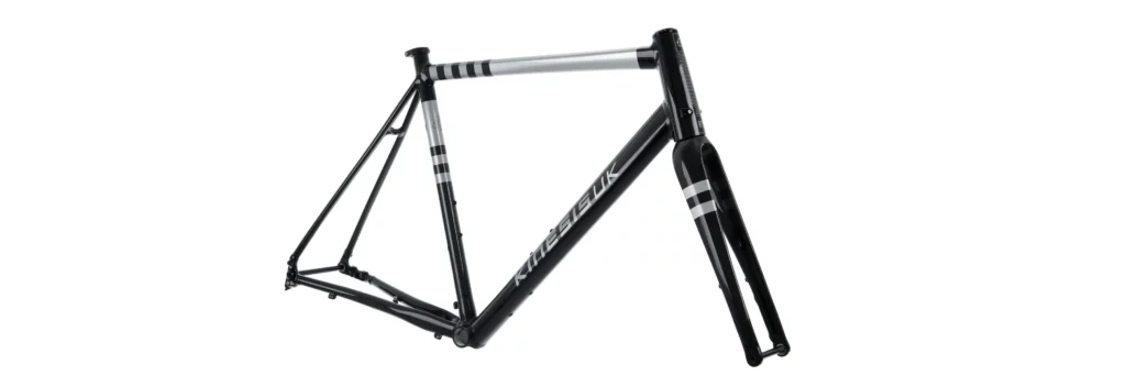 En vue d’un projet futur, j’ai également un kit cadre venant de chez Kinesis UK avec le modèle en aluminium scandium. Modèle taillé pour la longue distance sur tous types de terrain. Il est robuste, confortable et très performant. Il fait honte a beaucoup de cadres en carbone, un des rares cadres en aluminium remettant en cause la nécessité de recourir au carbone. Le Kinesis RTD n’est disponible uniquement que sous forme de kit cadre avec une fourche Futura 100% en carbone de chez Columbus (fournisseur italien). Le fondateur de Mason Cycles était resté 15 ans à travailler et fabriquer des vélos en aluminium chez Kinesis UK. La philosophie de ces deux marques est de fabriquer des vélos confortables à la conduite sublime en métaux sans utiliser le carbone. Le cadre peut accepter des pneus d’une taille maximum de 700X35C, ce qui est dans la norme des vélos d’endurance all-road. Le cadre polyvalent peut être équipé de garde-boues et un porte bagage. Deux couleurs sont disponibles : Noir et Blanc. Les 7 tailles de cadre proposées vont du 48 cm au 63 cm. Le cadre est très léger avec une peinture brillante (noir et gris) magnifiquement exécutée. C’est un vélo qui a été développé en collaboration avec le défunt Mike Hall, le fondateur de la course d’ultra distance amateur en autonomie (Transcontinental Race) à travers l’Europe, sur une distance de 4000 km.