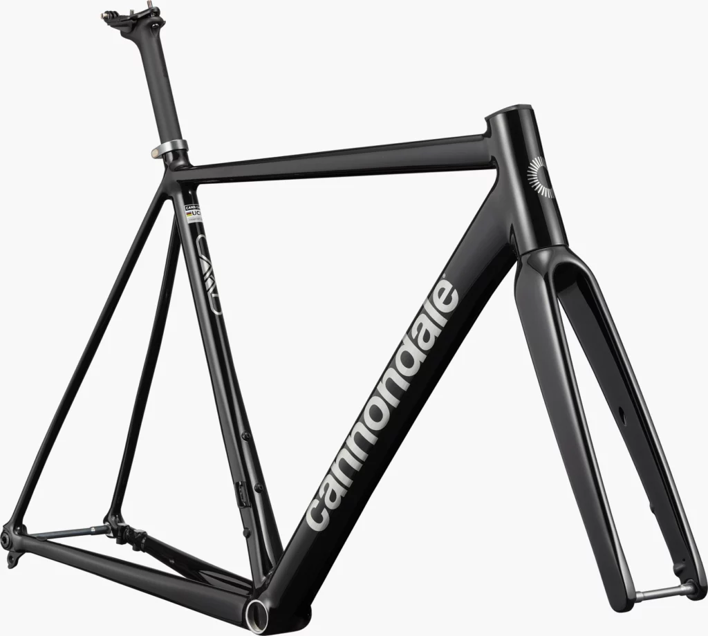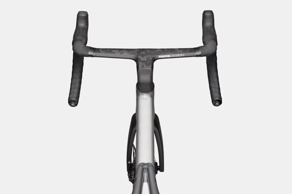 Le cadre accepte des pneus d’une largeur maximale de 32 mm. La fourche en carbone avec un pivot de direction en forme de part de pizza, cela donne un tube de direction aminci améliorant ainsi le look du vélo et produisant des gains aérodynamiques. Bonne nouvelle pour les mécanos du dimanche, le boîtier de pédalier est fileté BSA de 68 mm pour plus de fiabilité et robustesse. La patte de dérailleur arrière est de type UDH propriétaire de SRAM qui tend à se généraliser sur les vélos modernes. La tige de selle est de 27,2 mm en carbone ou aluminium selon la finition qui vous intéresse. Rappelons que le model précédent le CAAD 13 avait les haubans abaissés en joignant le tube de selle comme sur le SuperSix Evo dont il était une interprétation en aluminium. Il avait même des formes de tube aéro à l’époque. Côté design, on remarque une dissimulation complète des câbles et durites pour un look épuré très moderne et réussi. Pour le CAAD 14, Cannondale affirme s’appuyer sur les qualités propres du matériau.